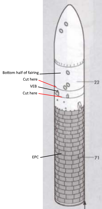 - Part 13 of the kit contains the EPC, VEB and part of the fairing. You have to remove the VEB and insert the ESC-A stage here. The image on the right shows where they are and where you have to cut these parts. You can cut on the panel lines.